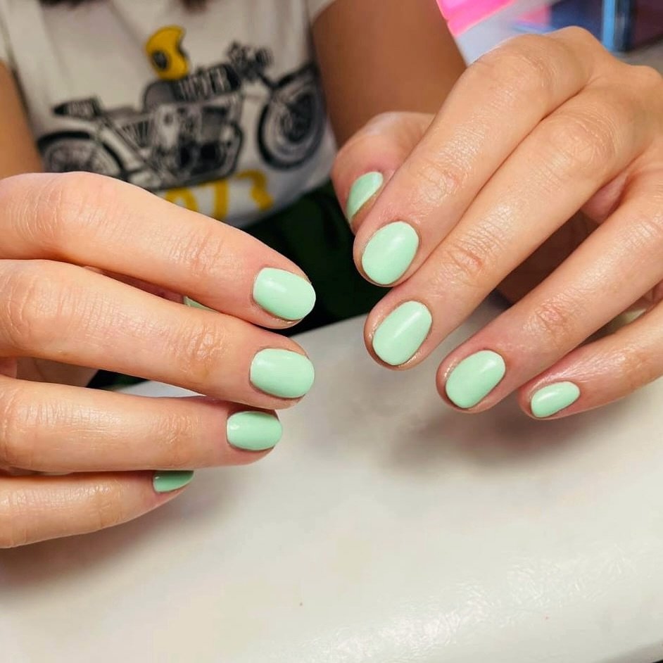 Short, rounded nails in a creamy mint feel fresh and unfussy. There is something so confident about a neat, compact manicure that does not rely on length to make an impact.