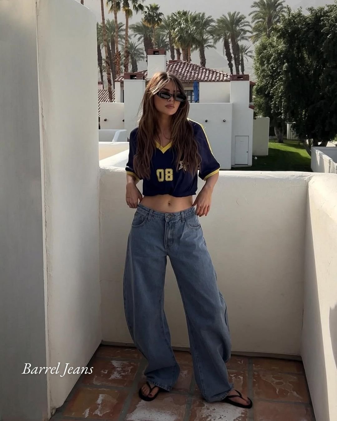 Barrel jeans bring volume and attitude, especially paired with a cropped sporty top and sleek sunglasses. The relaxed fit gives movement, while the fitted top keeps the proportions balanced.
