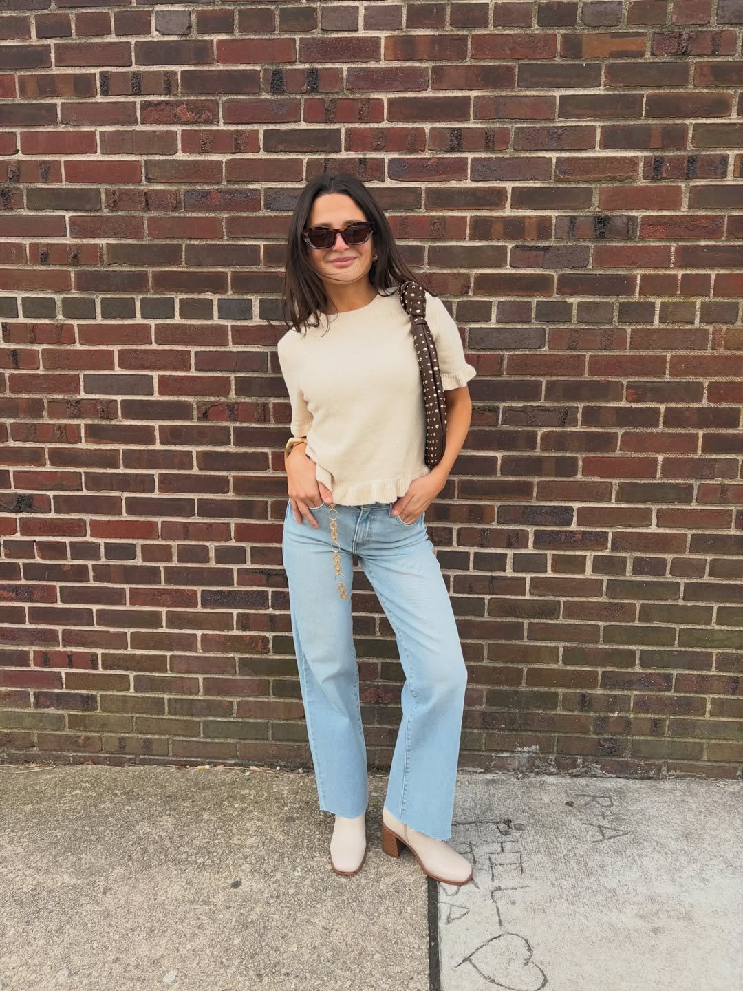 A short-sleeve knit tucked into light straight-leg jeans is minimalism done right. The ankle boots and studded shoulder bag add personality without overpowering the look.