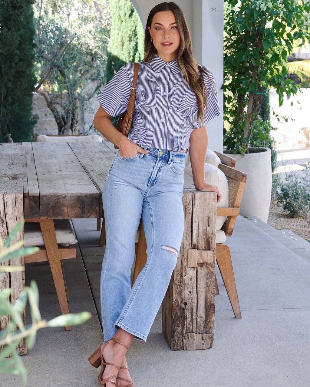 A striped button-up tucked into lightly distressed jeans feels timeless. The structured bag and block heels bring polish, while the soft wash keeps everything relaxed.