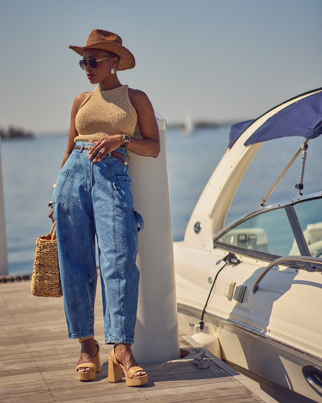 High-waisted denim styled with a ribbed halter knit and woven platform heels feels like summer by the marina. The straw hat and structured basket bag add texture that makes the whole look feel layered and intentional.