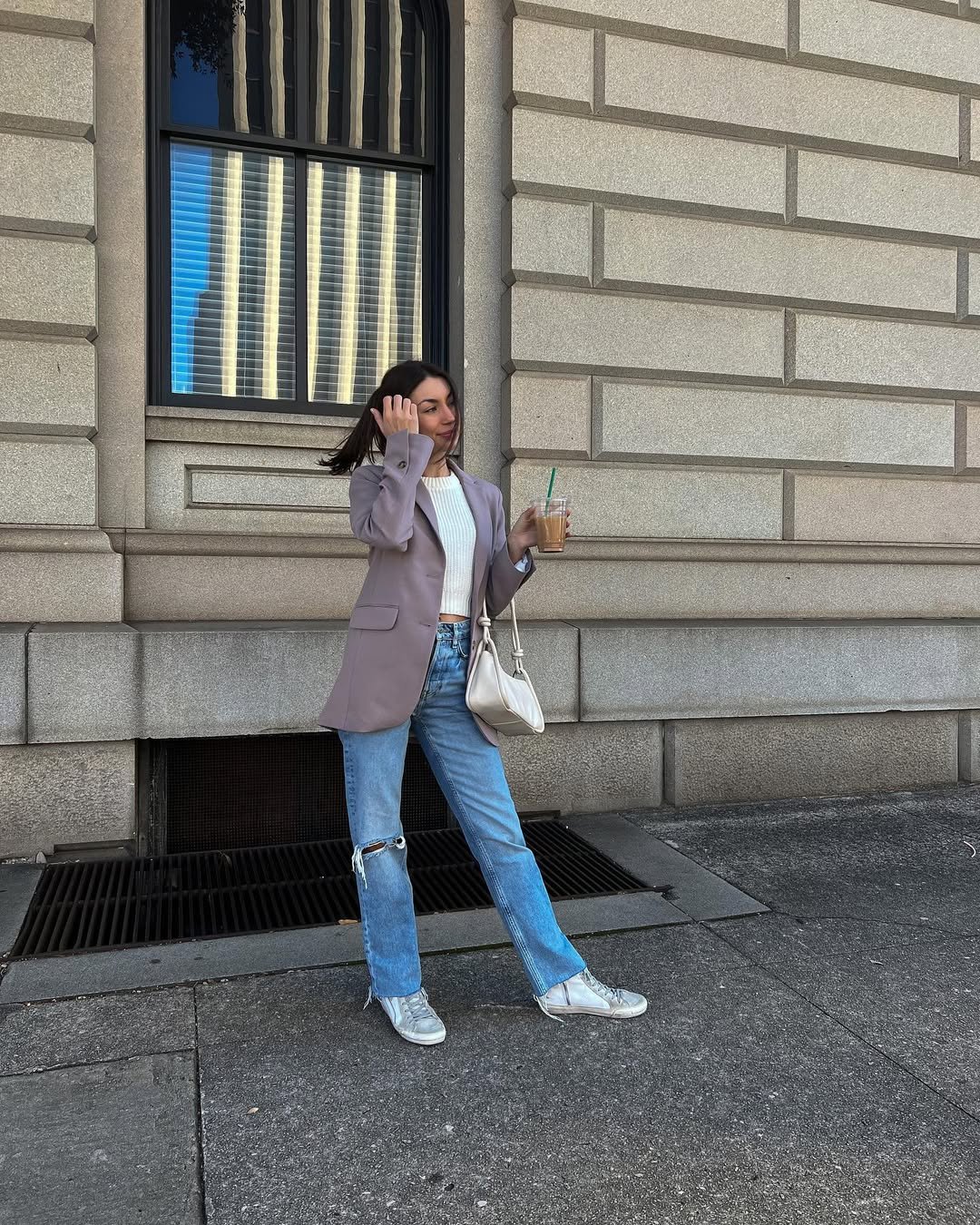 An oversized taupe blazer over a simple knit and lightly distressed straight-legs? Yes, please. Add worn-in sneakers and an iced coffee in hand and you’ve got that effortless “I just stepped out for a quick meeting” energy. It’s polished without feeling precious.