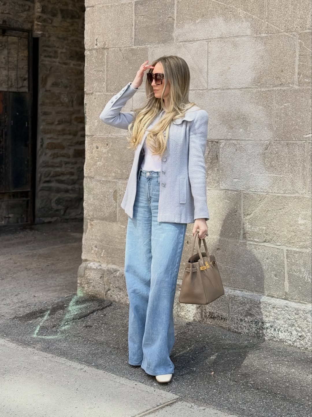 There’s something about this silhouette against that classic stone backdrop that feels cinematic. Relaxed jeans balance the tailored pieces, proving once again that light wash denim can step into luxury territory when styled with intention.