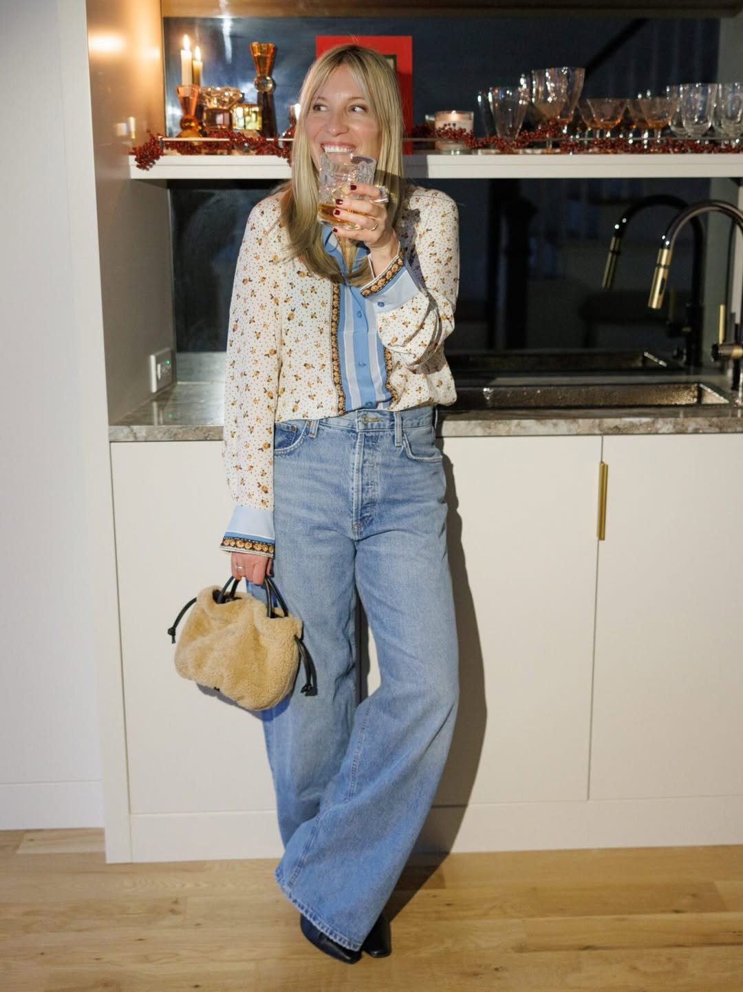 High-rise light wash flares paired with a patterned blouse feel playful yet polished. The soft texture of the handbag and dark boots bring warmth, making the whole look feel perfect for an evening in.