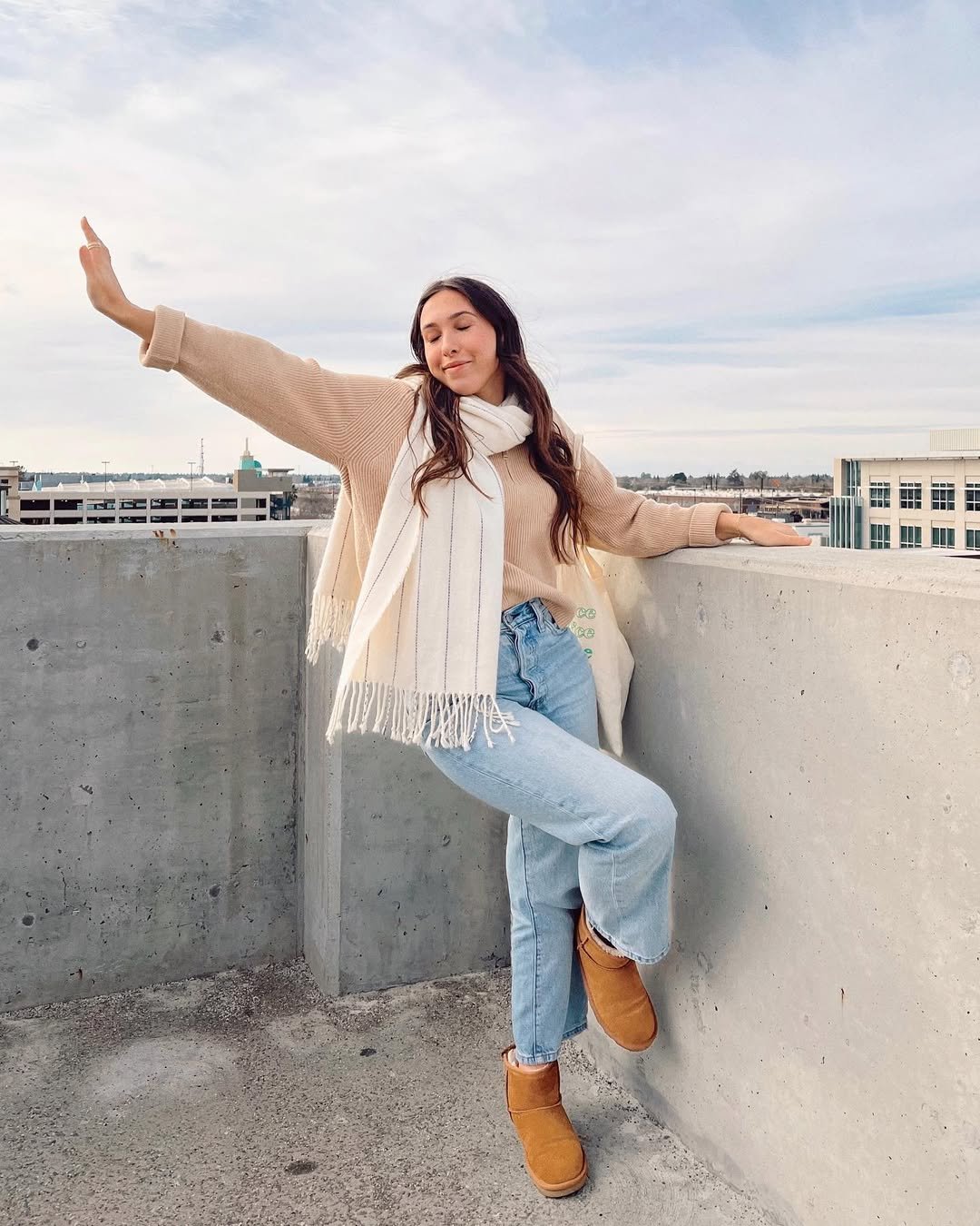 A chunky knit sweater with a long fringed scarf paired with light wash jeans feels like crisp air and open skies. The warm boots ground the look, adding a hint of rustic charm.