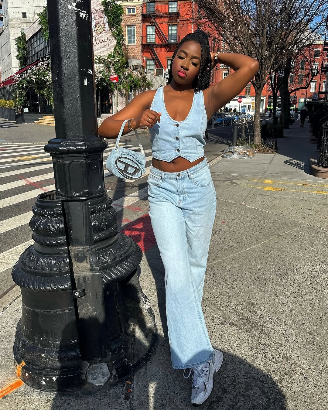 A matching light wash denim vest and jeans combo feels bold and cohesive. Paired with sneakers and a mini shoulder bag, it gives city energy without trying too hard.