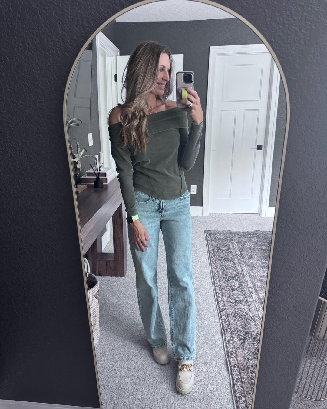 An off-shoulder olive top with light wash straight-legs creates contrast in the best way. The soft drape of the neckline feels feminine, while the clean denim cut keeps things sharp.