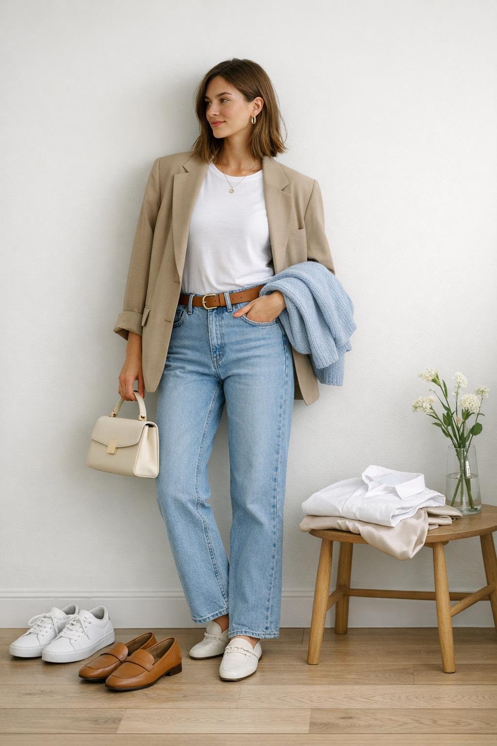 A beige blazer, white tee, and light wash jeans is one of those forever combinations. The brown belt ties everything together, and the soft knit draped over the arm adds depth without bulk.