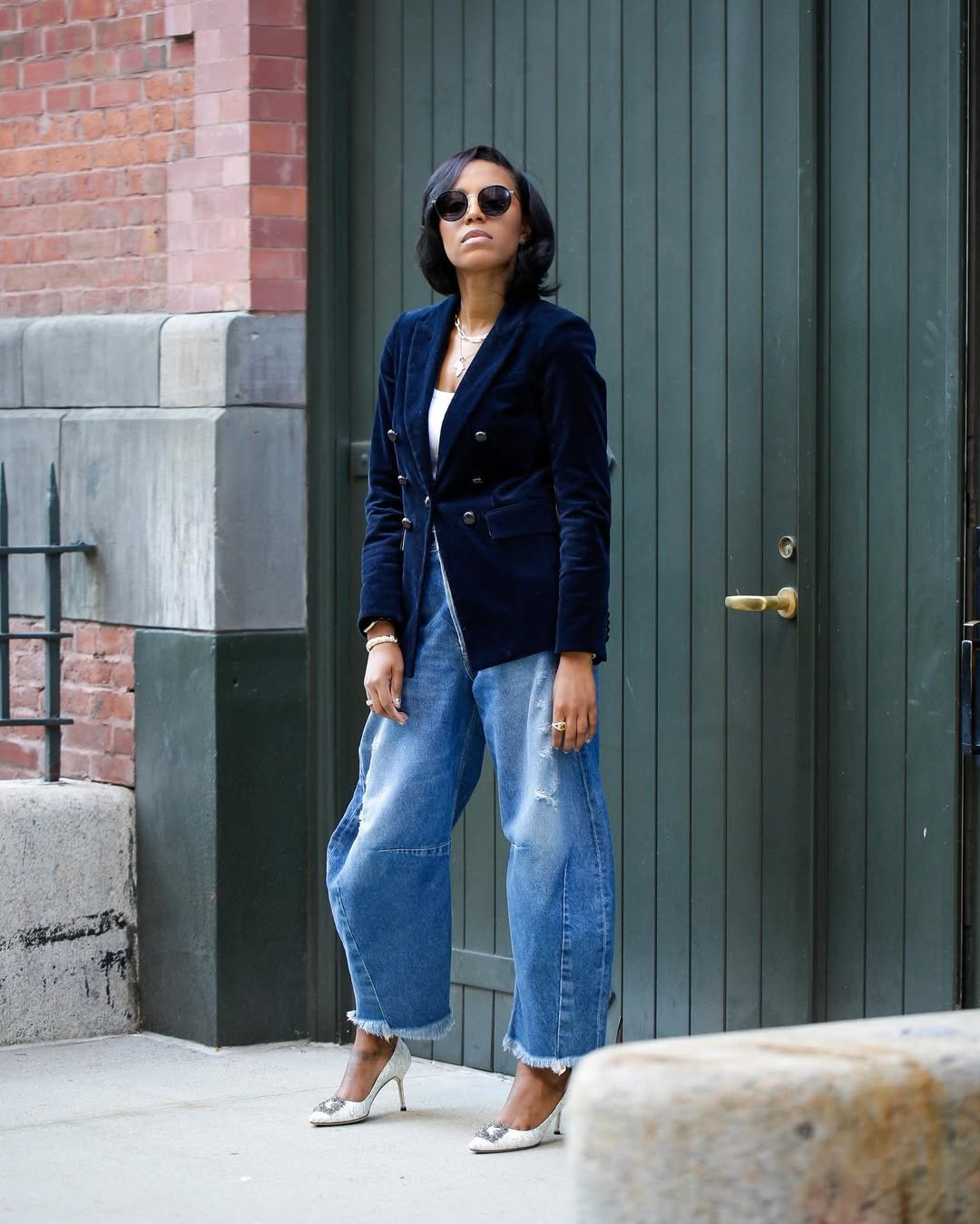 A navy double-breasted blazer over light wash jeans never fails. The sharp tailoring up top balances the relaxed, slightly cropped hem, while pointed heels elevate the whole silhouette.