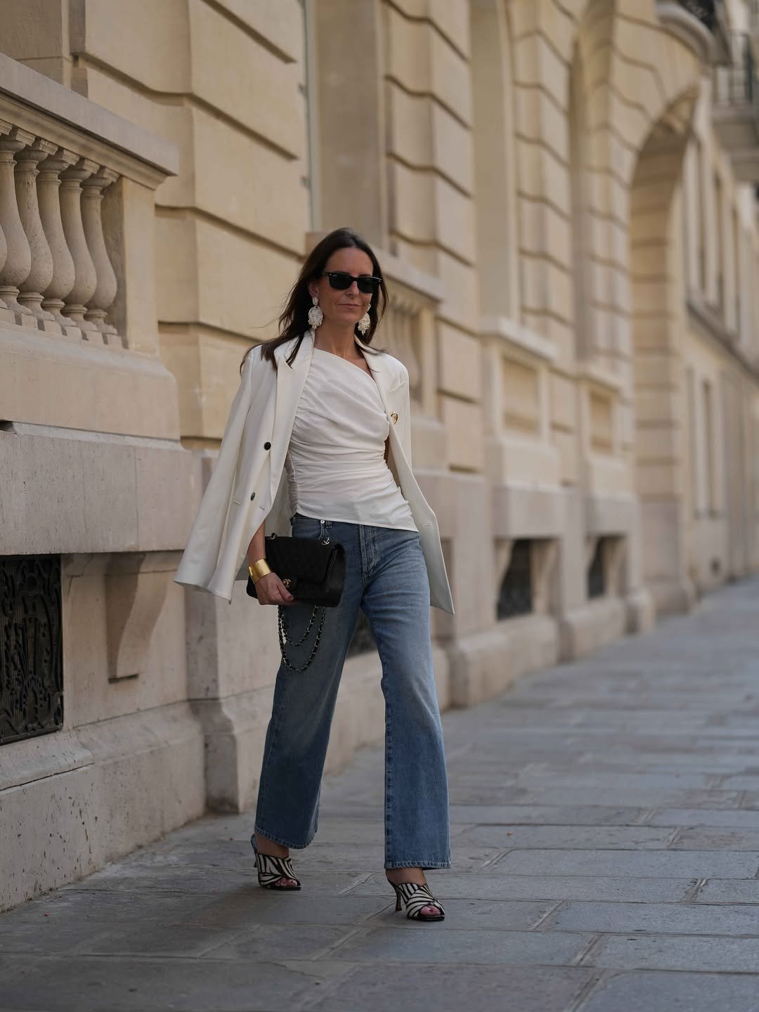 Wide-leg light wash denim paired with a ruched ivory top and a draped blazer feels like a quiet masterclass in grown-up style. The gold cuff, oversized earrings, and sharp sunglasses add just enough polish, while the zebra heels sneak in a bit of personality. It’s structured but never stiff.