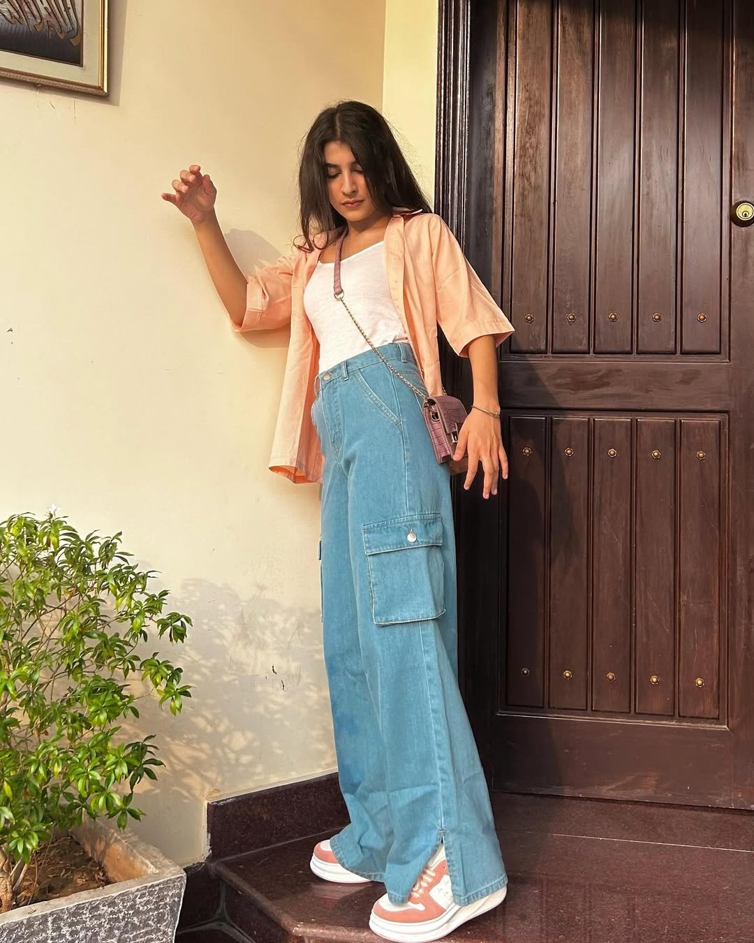 Oversized cargo jeans meet a soft peach shirt and platform sneakers, and suddenly denim feels fun again. The slouchy pockets and wide leg silhouette give the outfit edge, while the muted tones keep it from feeling loud.