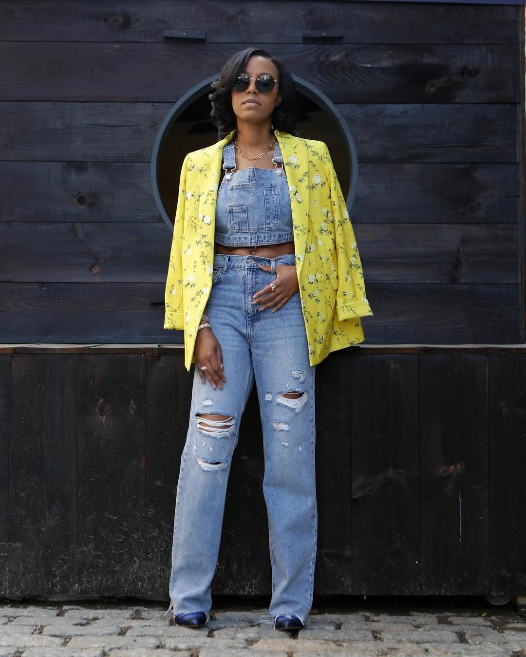 Same denim energy, totally different mood. The bright floral blazer layered over a cropped denim top turns light wash jeans into a statement base. The ripped details add attitude, keeping the look from feeling too polished.