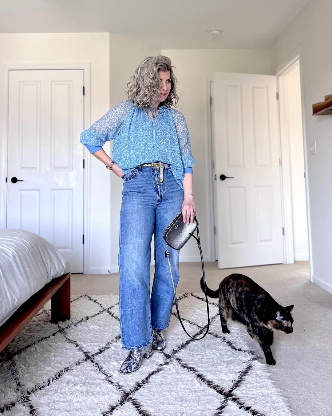 A breezy blue blouse tucked into classic straight-leg jeans feels effortless. The textured belt and sleek ankle boots add just enough detail to keep it interesting, while the small crossbody keeps things practical.