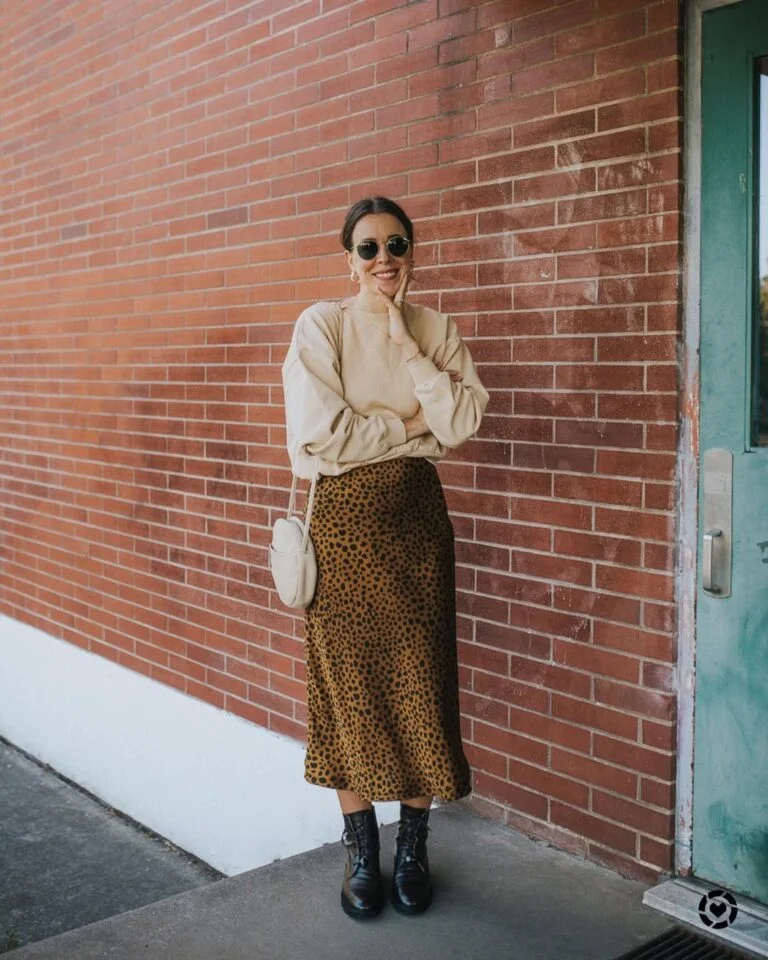 A leopard slip skirt and a cozy sweatshirt shouldn’t work together… but they absolutely do. This is that sweet spot where comfort meets cool, and the whole outfit looks like it knows exactly what it’s doing.