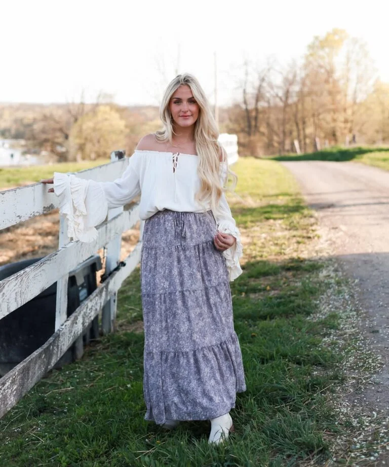 If a spring afternoon could wear an outfit, it would be this one. The off-the-shoulder top with those romantic sleeves pairs perfectly with the soft, printed maxi skirt. It’s the kind of look that makes you want to walk a little slower, just so the fabric gets more time to float around you.