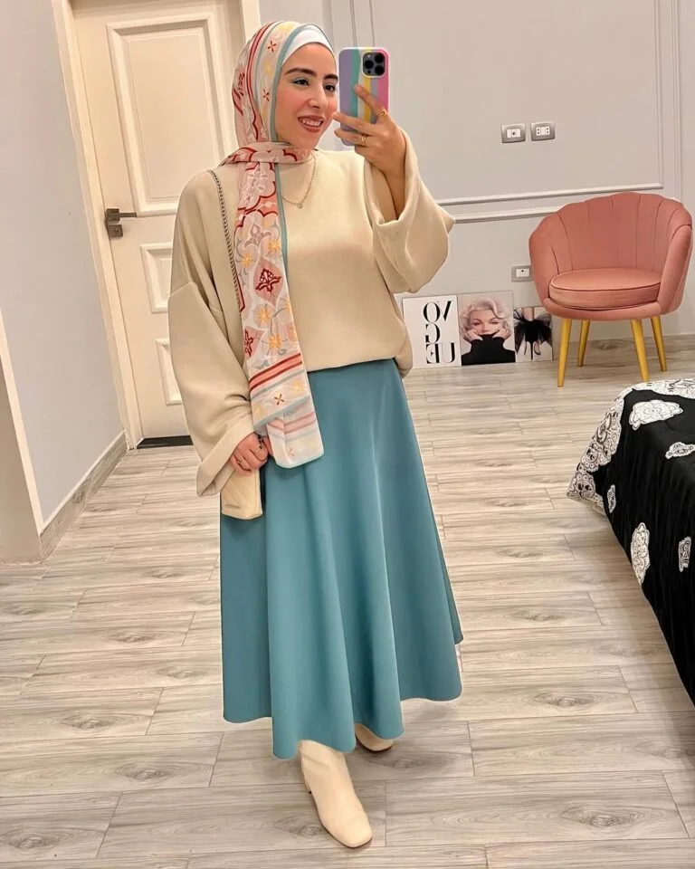 Aqua blue and soft cream? Yes, please. This outfit is such a clean take on modest fashion, with the skirt doing all the talking while the scarf ties every color together like a quiet little masterpiece. It’s polished in a “did it in five minutes but looks like an editorial shoot” kind of way.