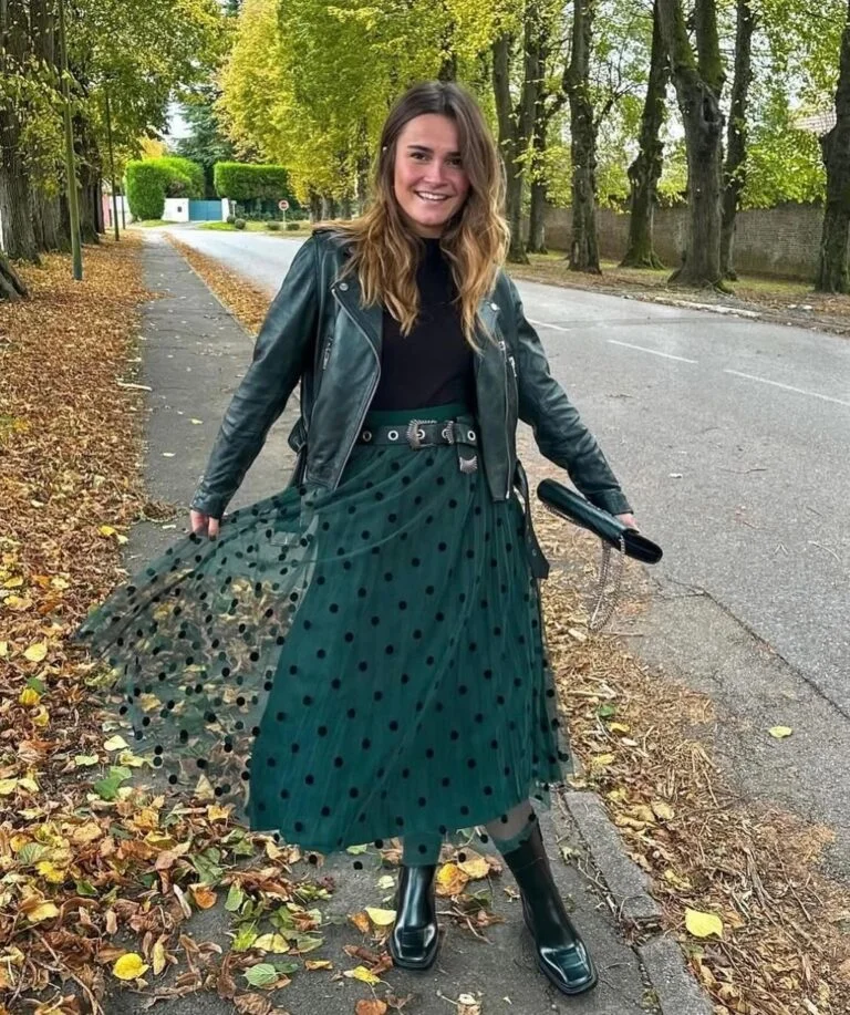 A dotted mesh skirt with a moto jacket is the perfect mix of feminine and edgy. It’s giving Parisian cool girl but with a sprinkle of whimsy.