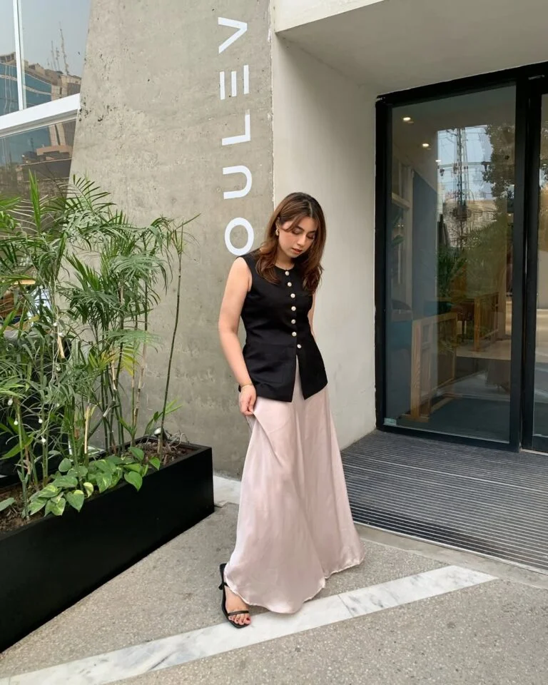 There’s something incredibly chic about soft satin paired with a structured top. The black buttoned vest adds definition, while the flowy blush skirt keeps things elegant and fluid. It’s minimal, modern, and just dramatic enough.