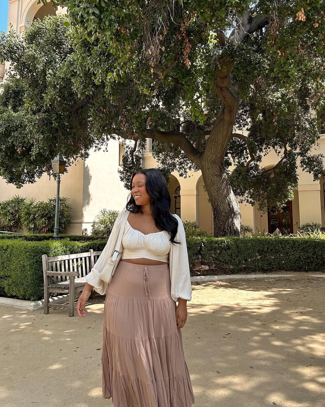 This look is basically a warm summer breeze in outfit form. The tiered skirt moves with that effortless sway, and the soft cream top keeps everything feeling romantic without trying too hard. It’s giving main character walking through the courtyard energy — and honestly, she understood the assignment.