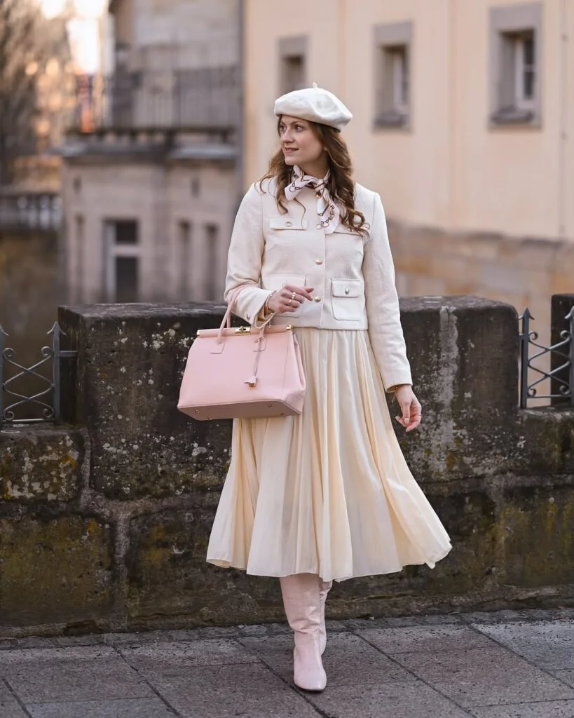 Soft ivory pleats, matching boots, a tailored jacket, and a beret — this look is practically a love letter to French femininity. It’s dreamy, romantic, and oh-so-timeless.