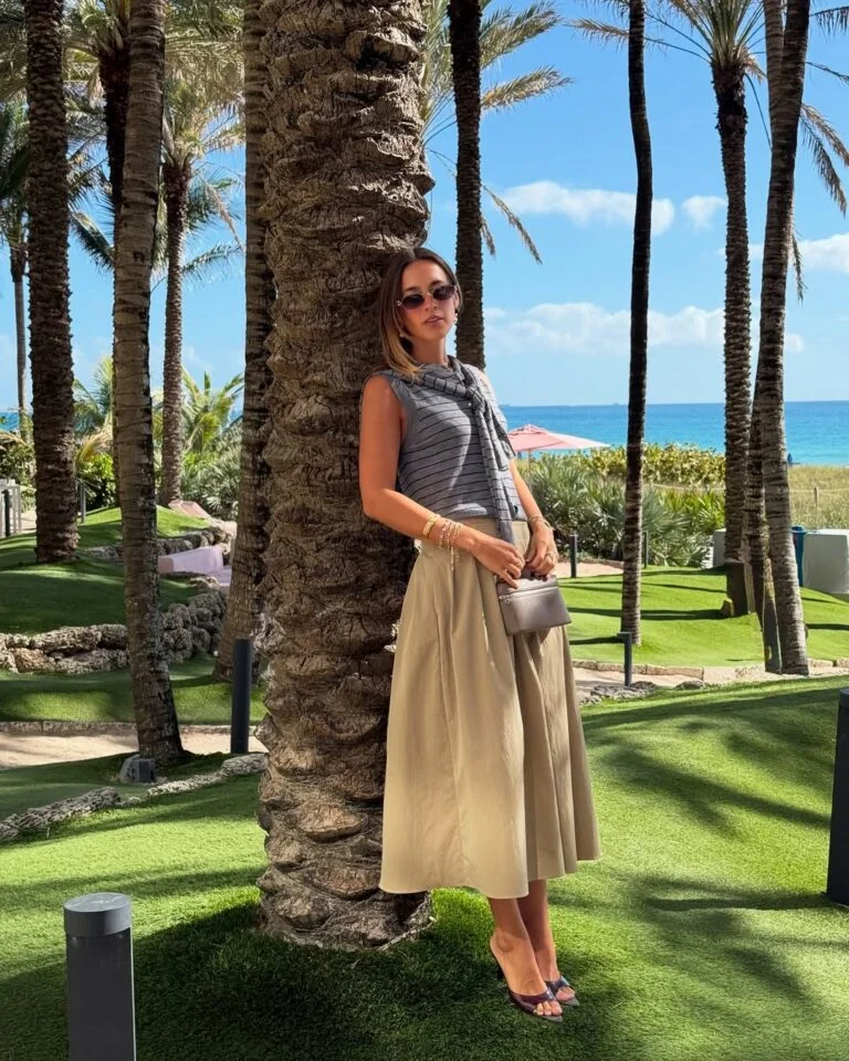 Soft beige skirt, striped sleeveless top, and sunny-day accessories—this outfit is pure relaxed sophistication. It’s casual enough for a beachside stroll but polished enough for an oceanside lunch.