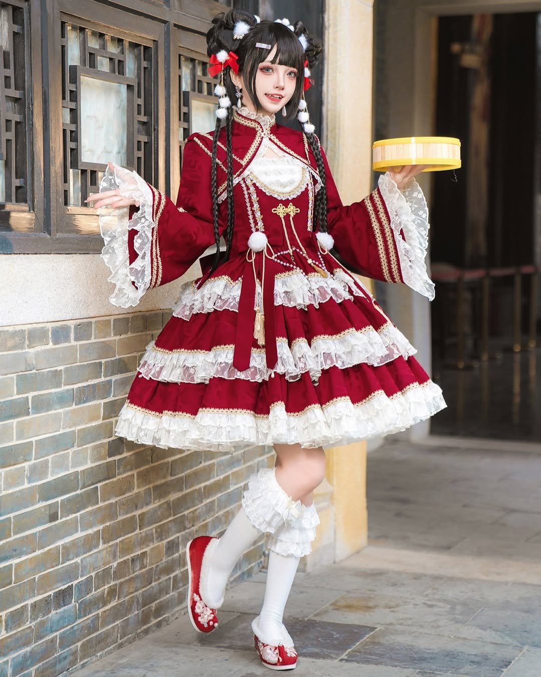 This look feels playful from the very first glance. The shorter hemline and softly structured sleeves give it a youthful, modern edge, while the rich red fabric keeps it grounded in Lunar New Year tradition. It’s festive, but not serious.