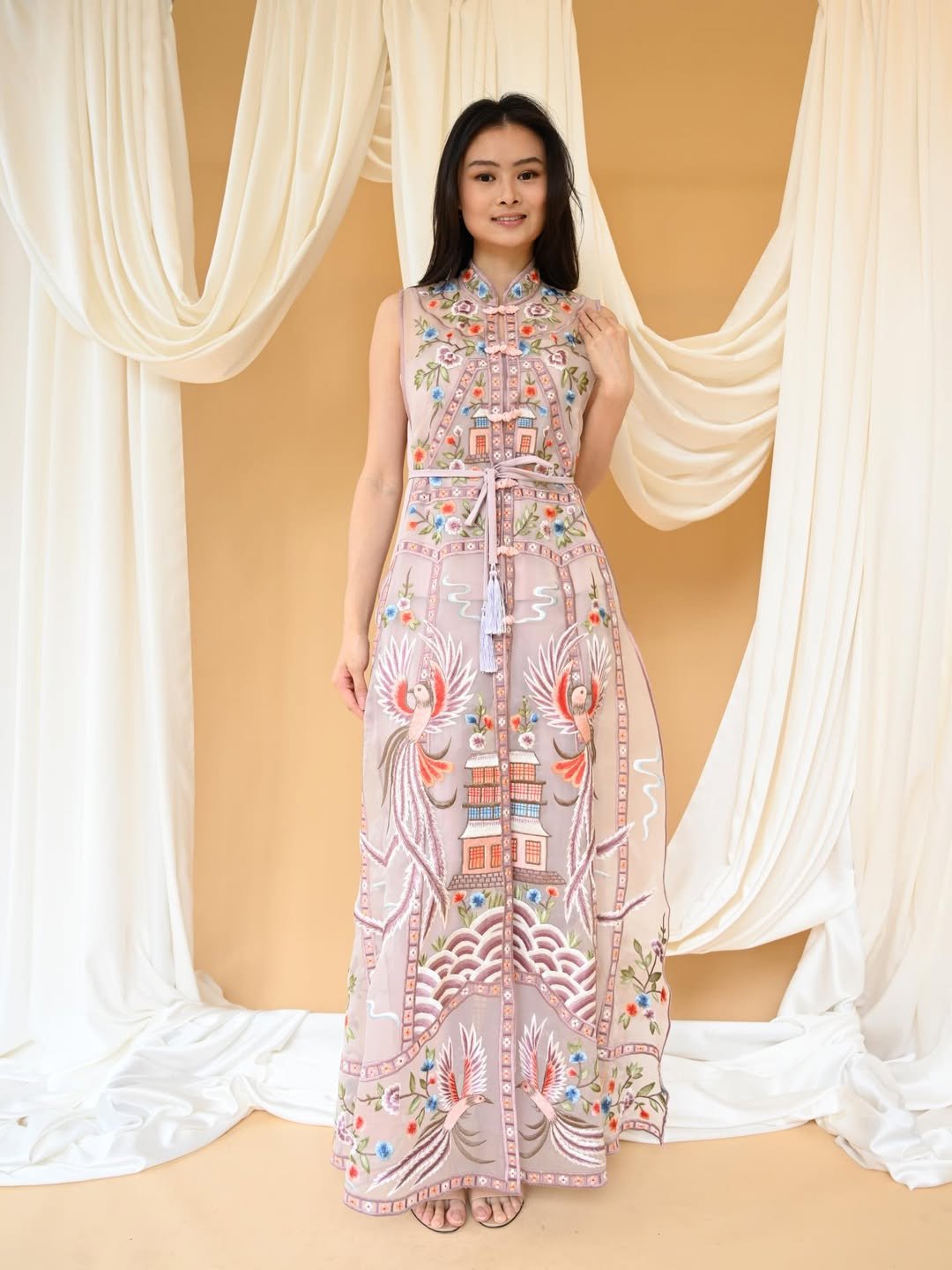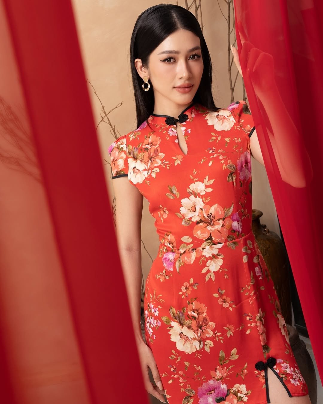 There’s something quietly cinematic about this dress. The fitted qipao shape paired with bold florals feels romantic, almost poetic, like a still from a Lunar New Year film scene.