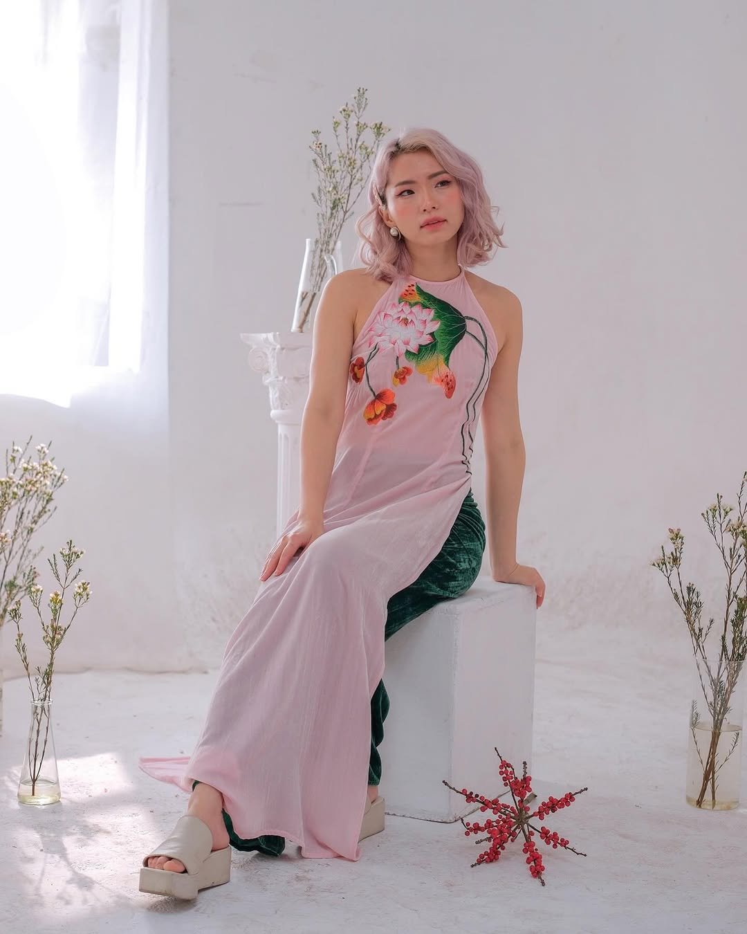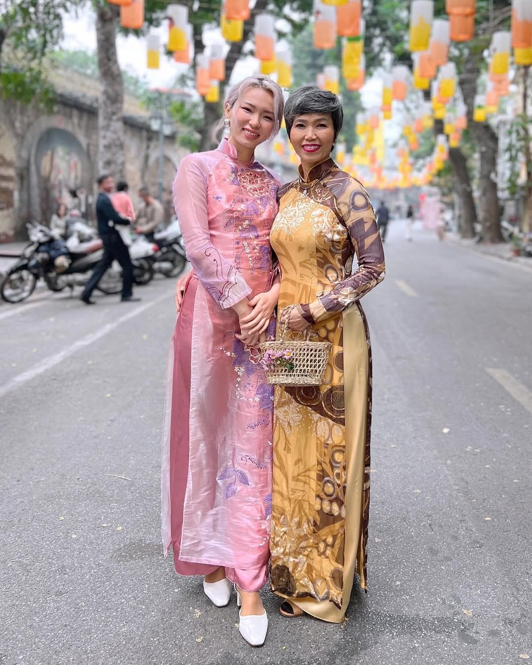 This look proves Lunar New Year fashion doesn’t need to stay indoors. The áo dài feels light, joyful, and very real—like it belongs on the street, in motion, in celebration.