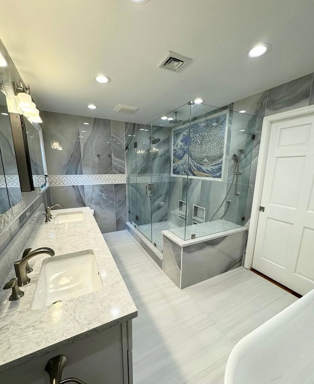 This one is all about that bold marble moment. The veining is strong, unapologetic, and honestly… kind of mesmerizing. It flows seamlessly from wall to wall, creating a cocoon-like effect that feels both dramatic and calming at the same time.