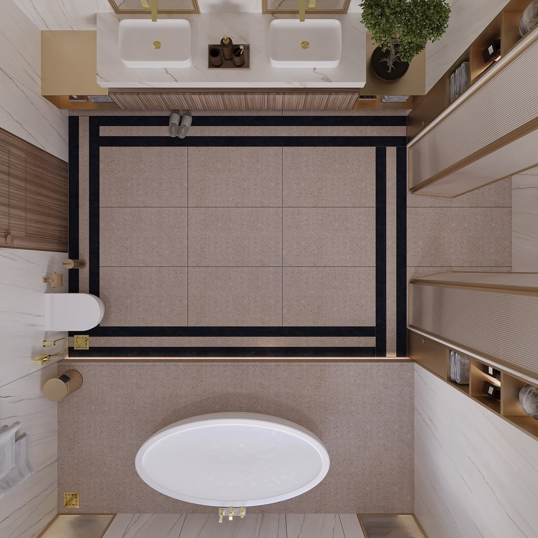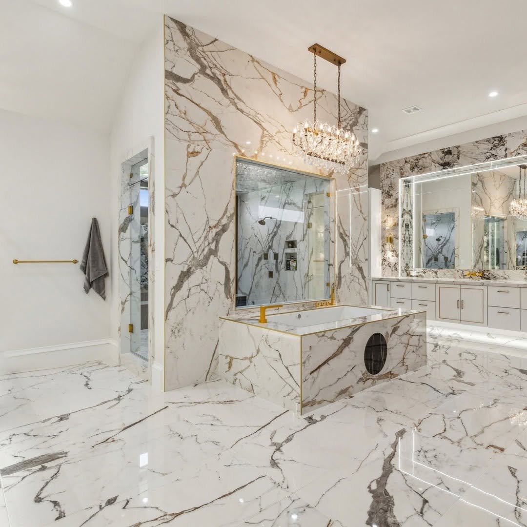 Ending strong with a bold architectural move. The raised tub platform, surrounded by marble, instantly elevates the entire space—literally and visually. It feels intentional, almost sculptural.