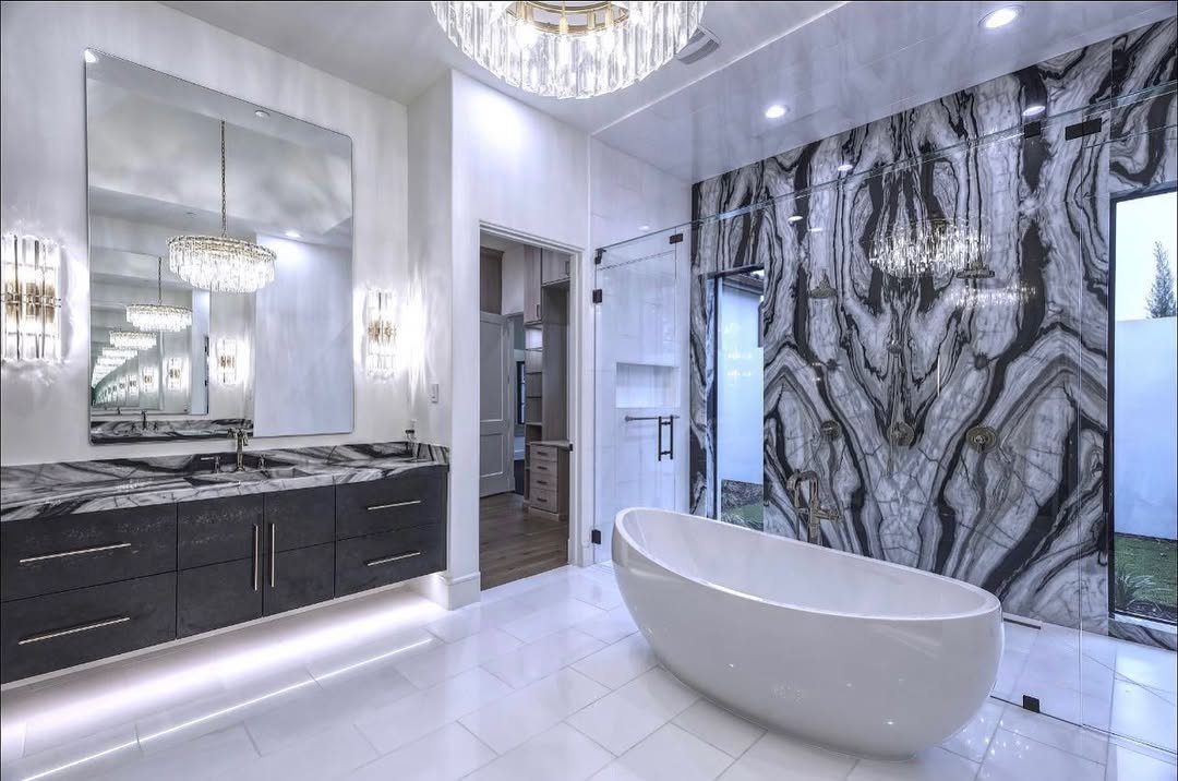 This space doesn’t just say luxury—it echoes it. That dramatic arched entry frames the freestanding tub like it’s a piece of art, while the chandelier overhead adds just the right amount of sparkle without feeling over the top. And those long double vanities? Clean, balanced, and seriously satisfying to look at.