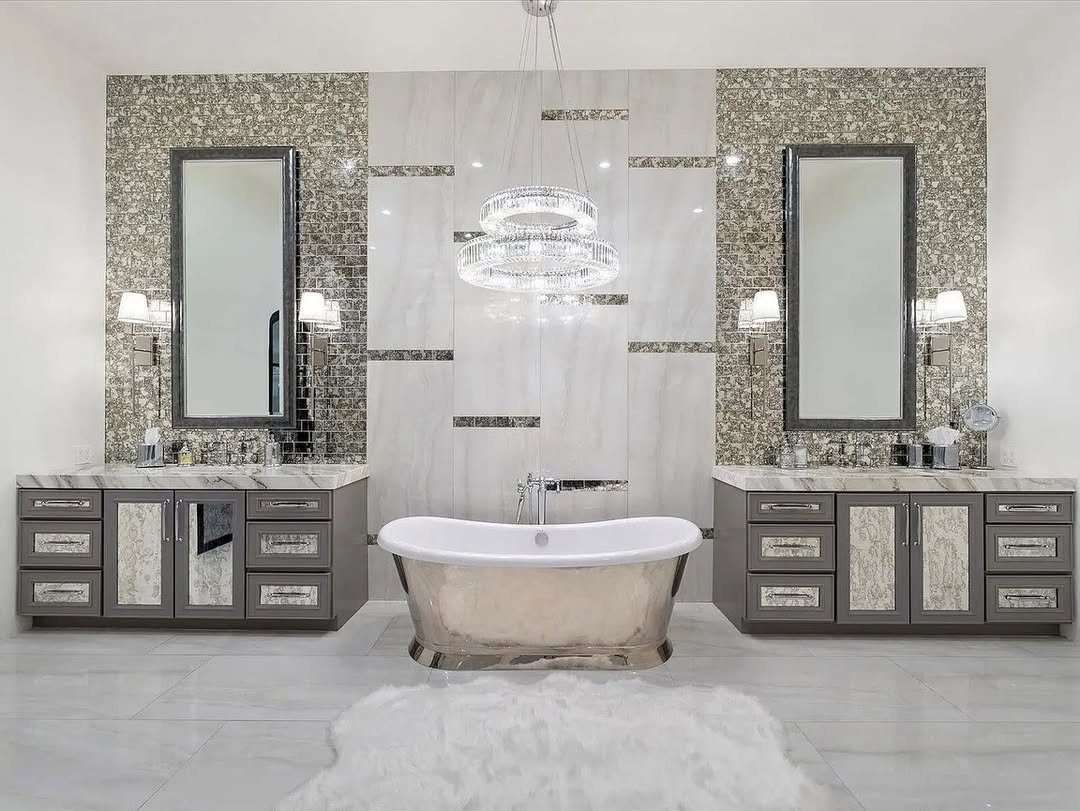 There’s something so satisfying about this perfectly balanced layout. Twin vanities, matching mirrors, and that centered tub—it’s giving calm, controlled luxury in the best way.