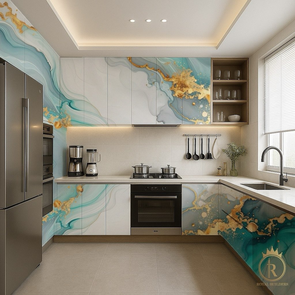 This kitchen takes marble somewhere unexpected. Instead of just countertops, it flows across cabinetry in soft, fluid patterns that almost feel like artwork.