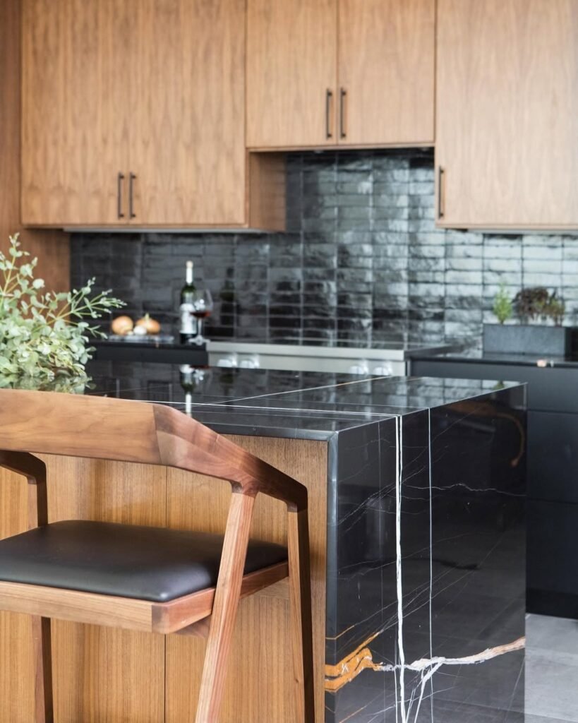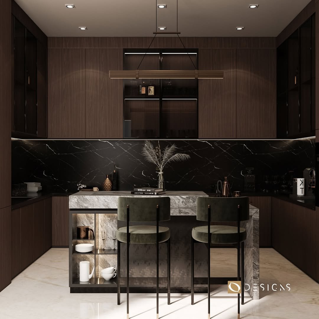 This one leans into contrast in the best way. That bold, high-contrast marble island against the rich wood cabinetry feels sharp, clean, and quietly dramatic.