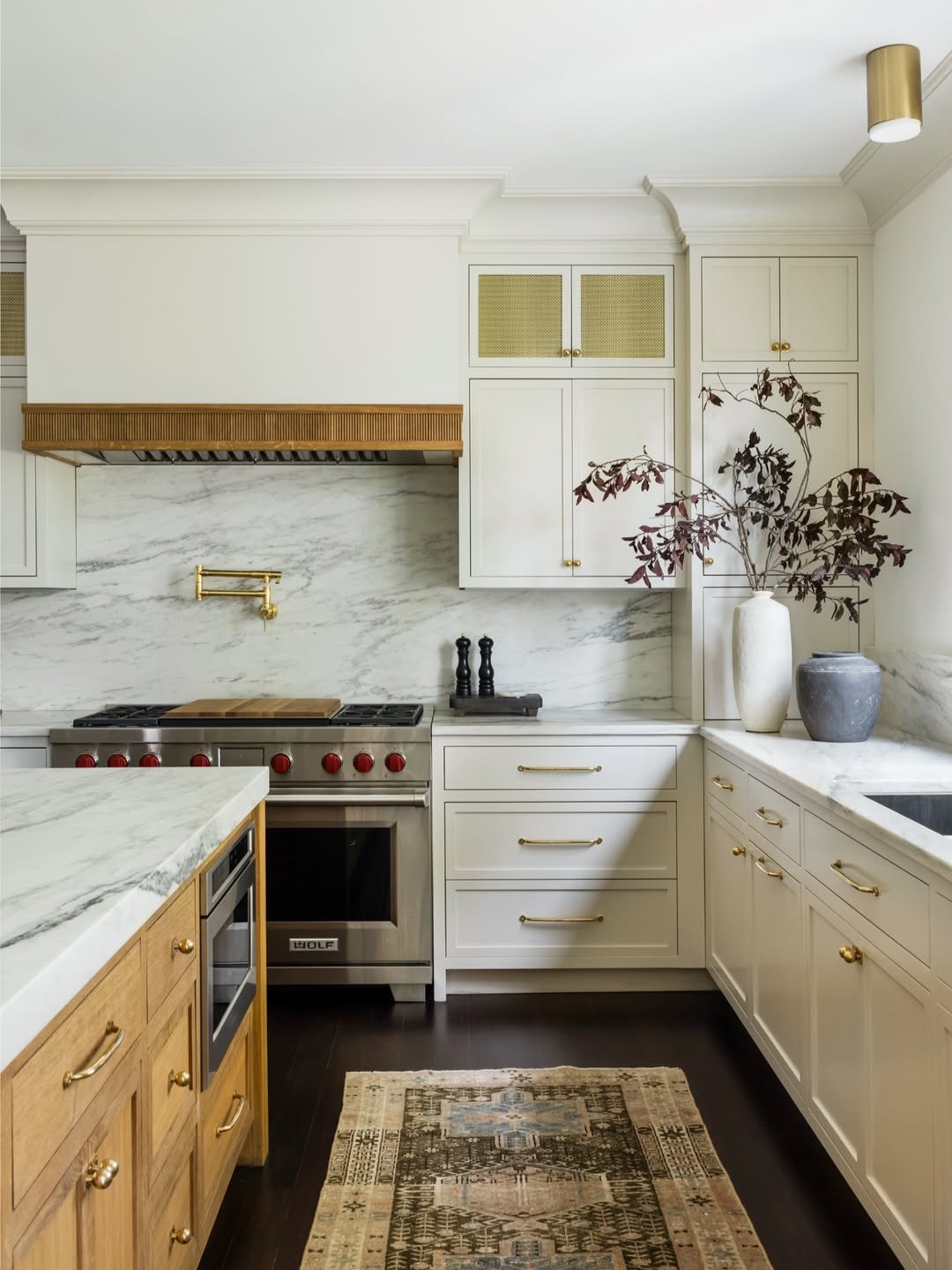 Soft cream cabinetry, warm wood accents, and hints of brass come together in a way that feels timeless. The marble surfaces add just enough movement without taking over the room.