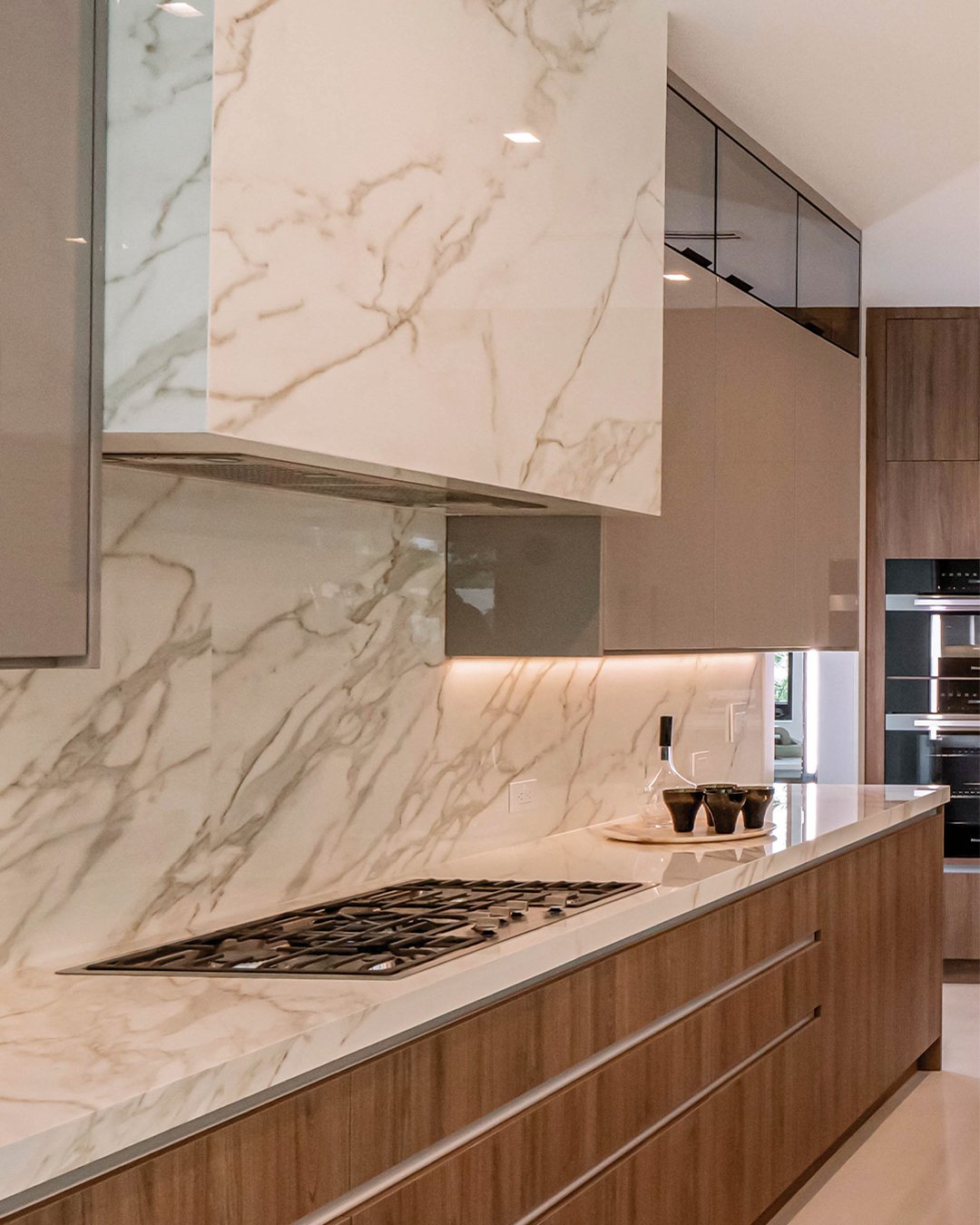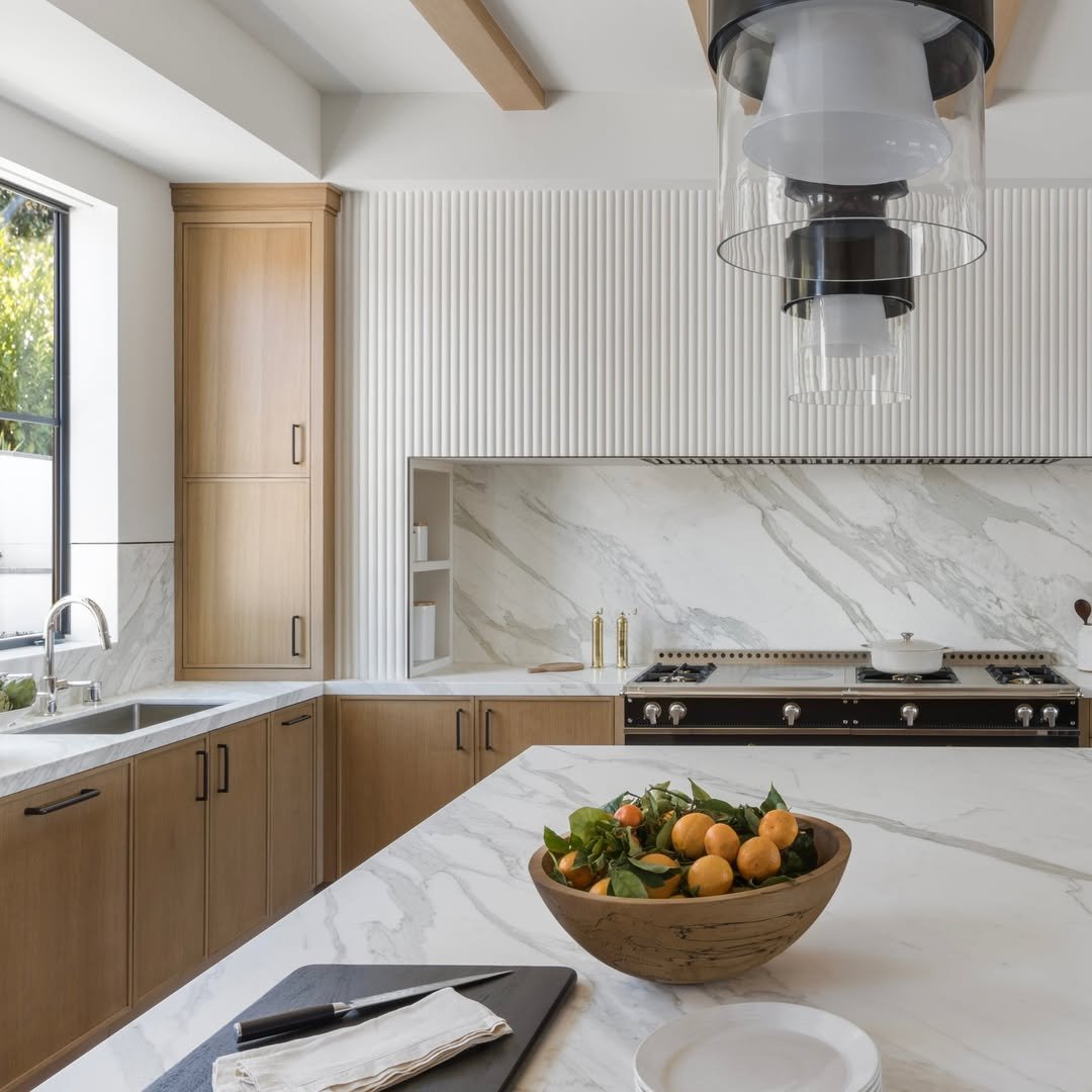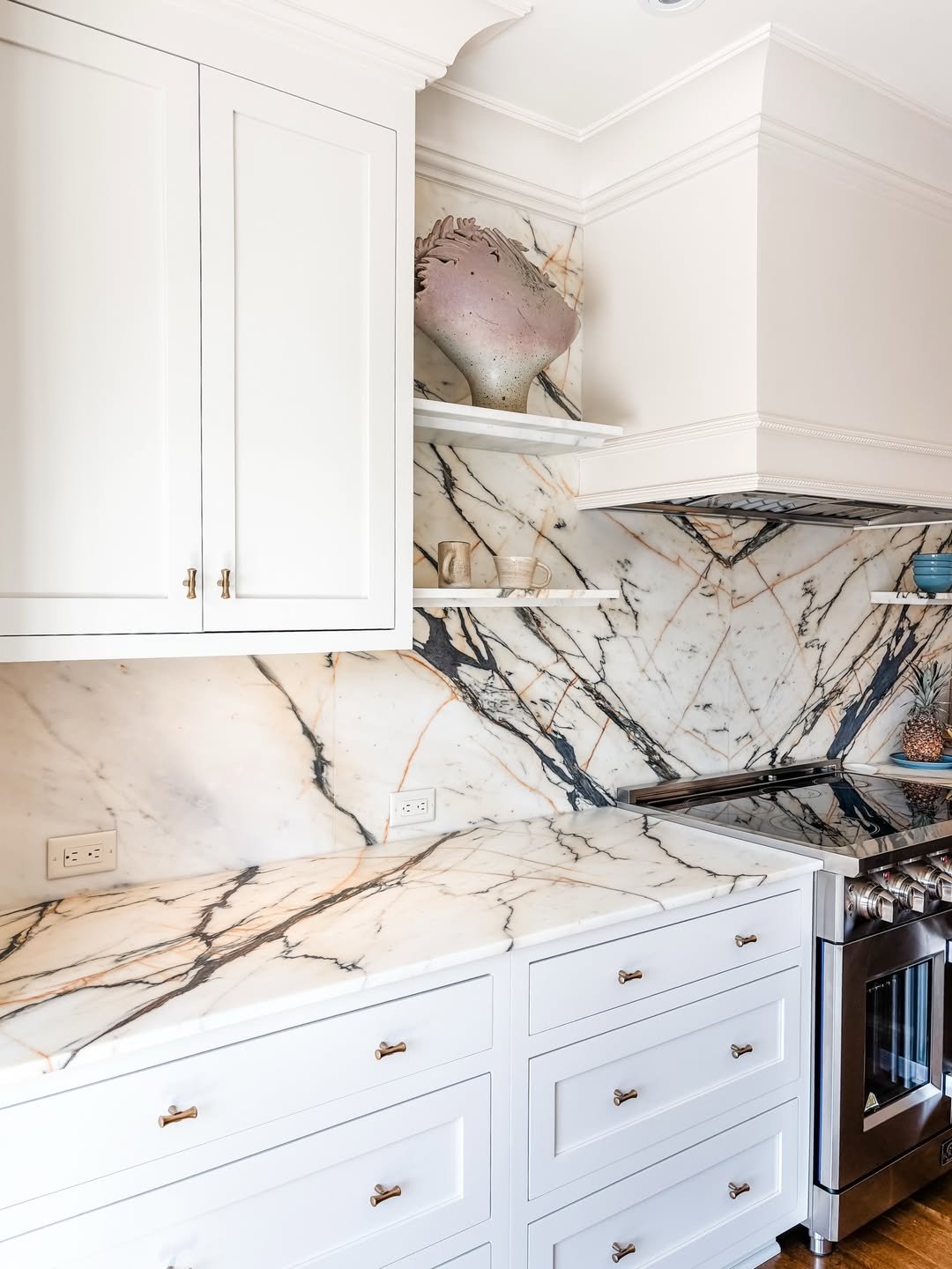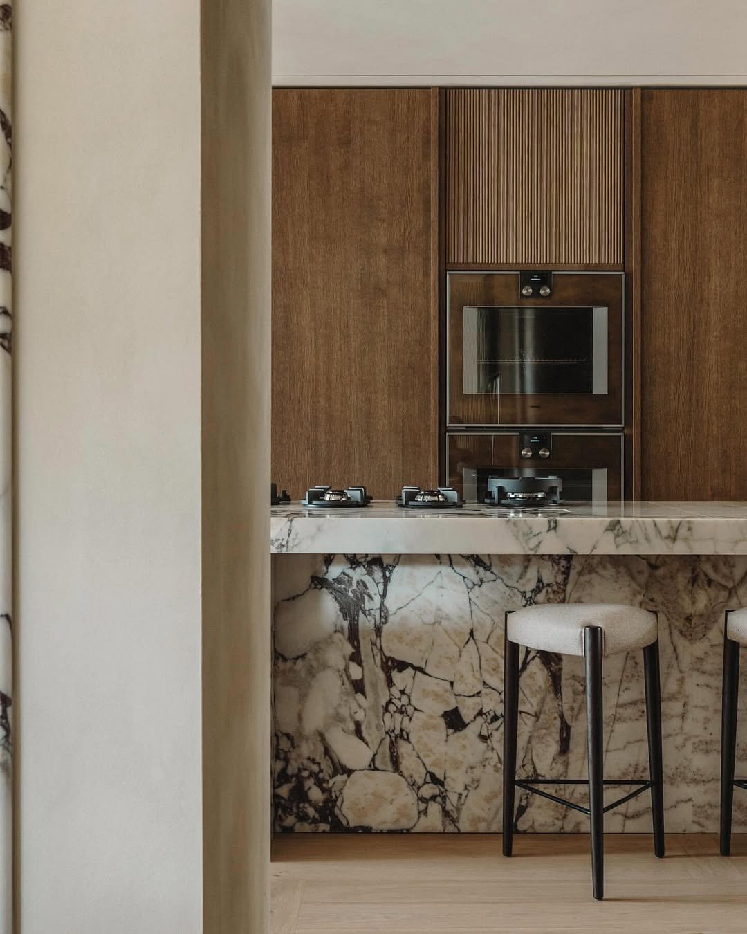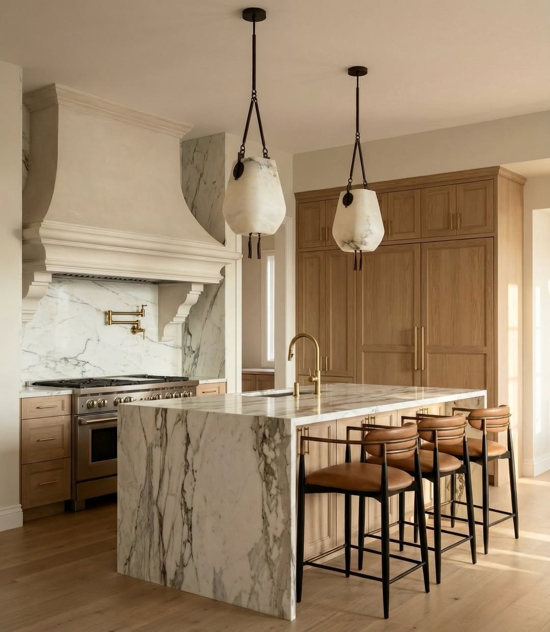 Here, marble isn’t just a feature, it’s the language of the whole space. It wraps from backsplash to hood in one continuous sweep, creating a sense of quiet luxury.