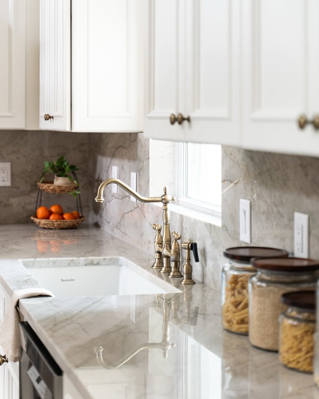 At first glance, it’s your classic white kitchen. But then the marble pulls you in, those dramatic veins running across the backsplash and counters like natural artwork.