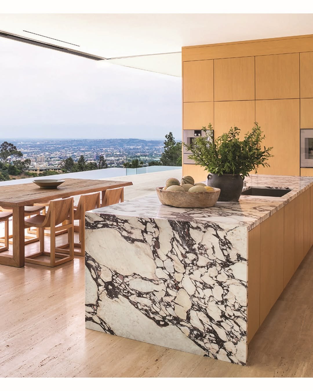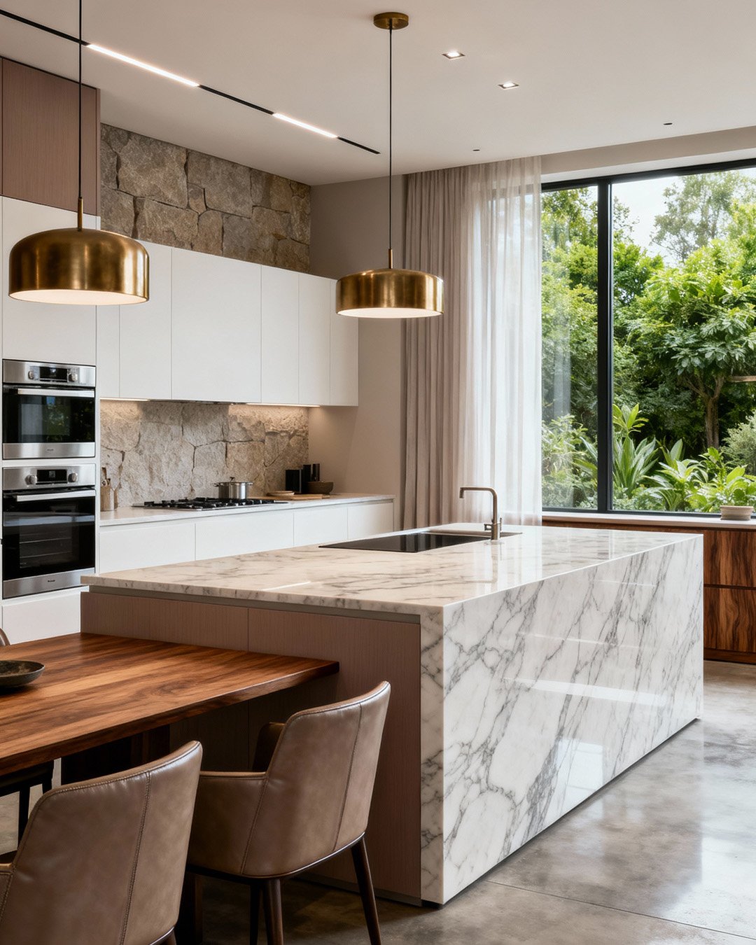 That marble island almost competes with the view, and somehow, they both win. The bold veining adds movement and depth, while the surrounding wood cabinetry keeps everything grounded and warm.