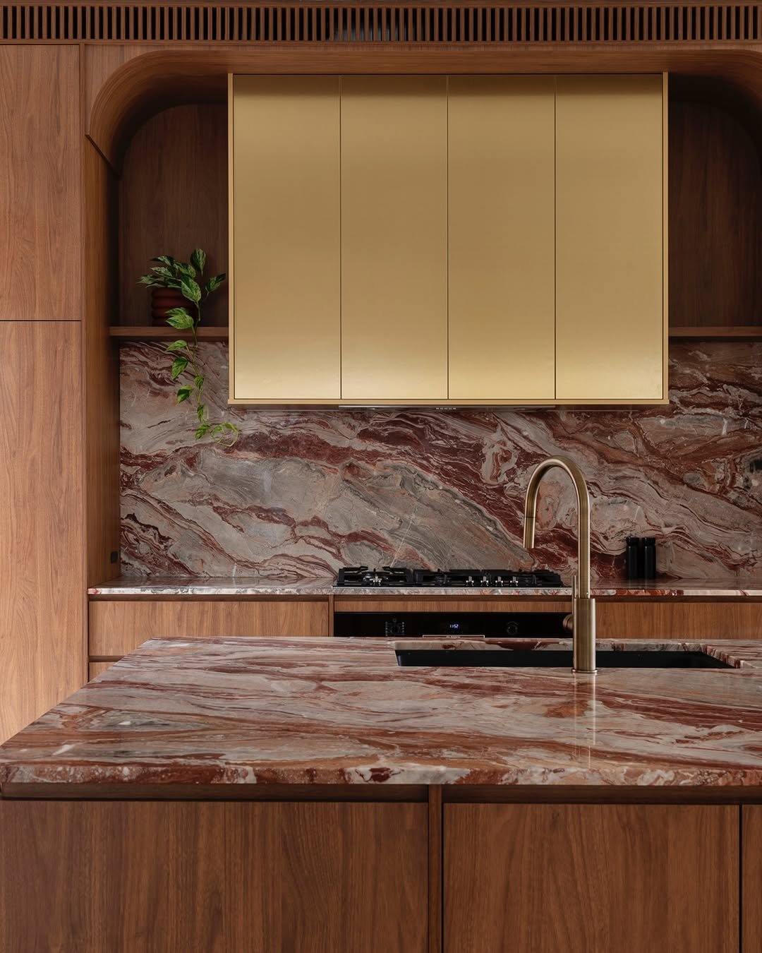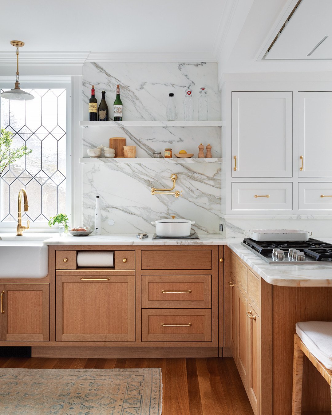 Open shelves against a marble backdrop always feel a bit like quiet styling magic. Here, the soft veining paired with warm wood cabinetry and brass accents creates a layered look that feels curated but not staged.
