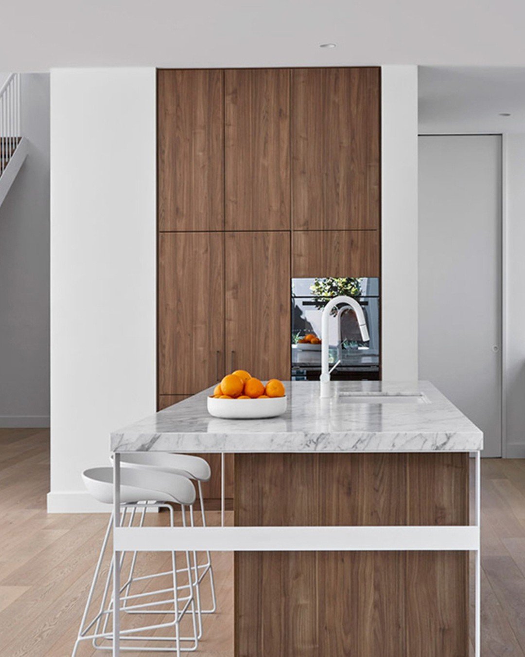 This one is all about restraint. Clean lines, warm wood panels, and a crisp marble island come together in a way that feels balanced and uncluttered.