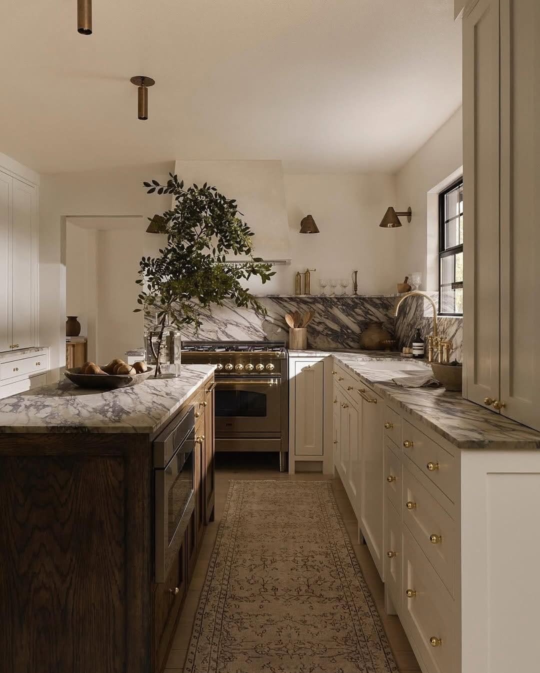 There’s something beautifully relaxed about this one. The exposed wood beam and soft plaster hood bring in that rustic warmth, while the marble island keeps things feeling fresh and elevated.