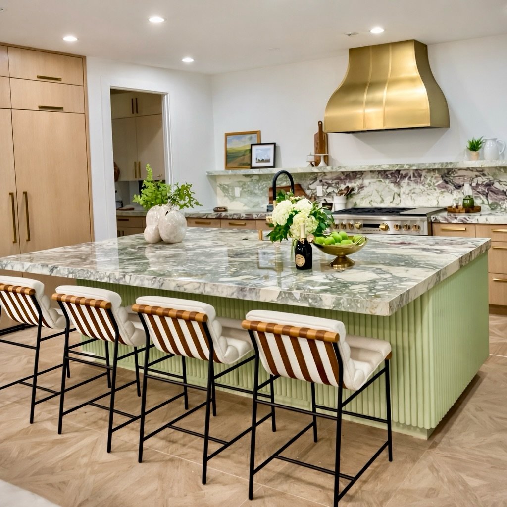 This kitchen feels like a statement the moment you walk in. The green-veined marble island paired with that sculptural brass hood creates a layered, almost jewel-box effect that’s rich without feeling heavy.