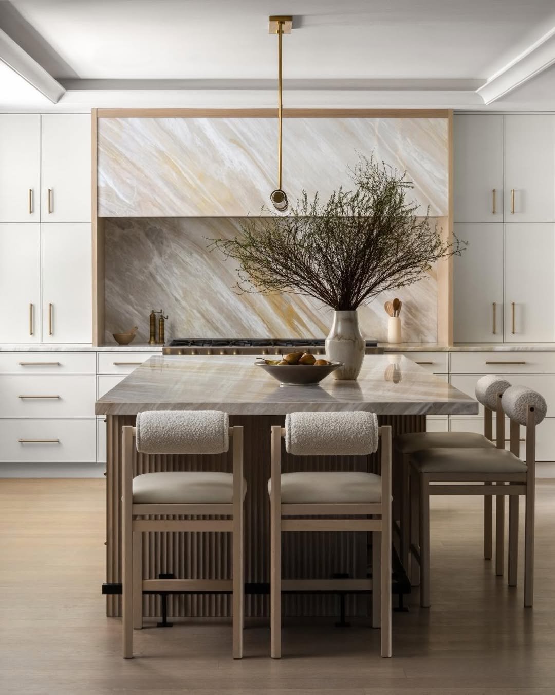 The marble backsplash here feels like artwork, setting the tone for the entire kitchen. Soft wood tones and neutral seating let it shine without competing for attention.