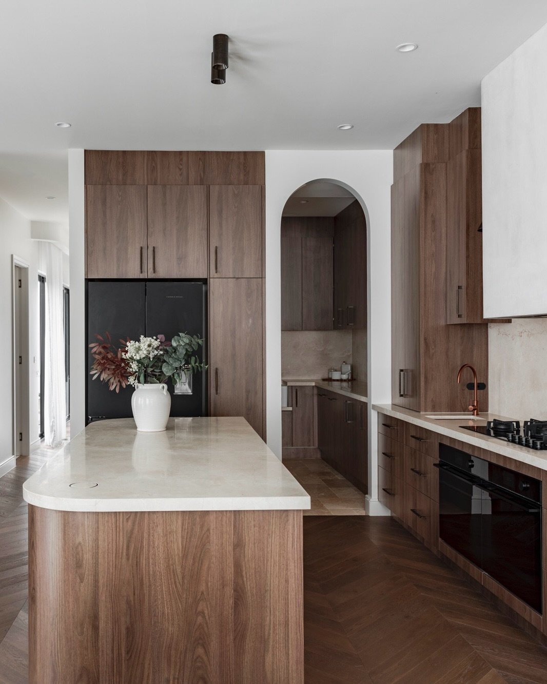 There’s a softness to this kitchen that comes from the way everything flows. The pale stone island, warm wood cabinetry, and gentle curves create a space that feels easy and cohesive.