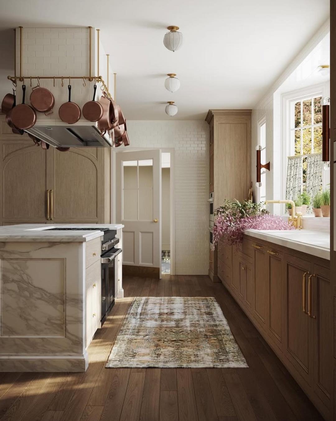 There’s a quiet romance to this space that feels almost nostalgic. The marble island, soft wood cabinetry, and those hanging copper pots create a layered look that feels collected over time rather than designed in one go.