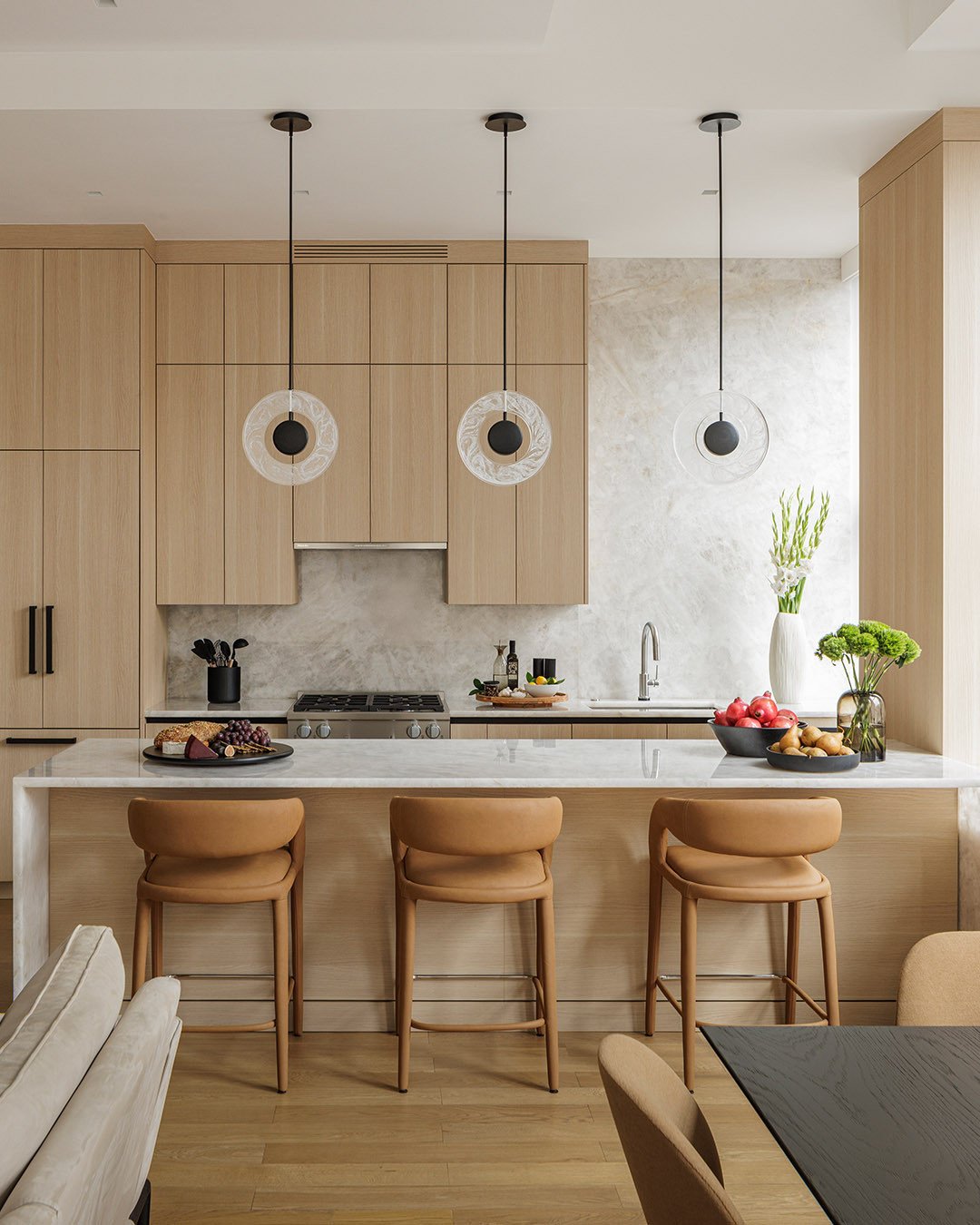 Natural light pours in and brings everything to life. The marble island reflects it beautifully, while the wood tones keep the space grounded and warm.