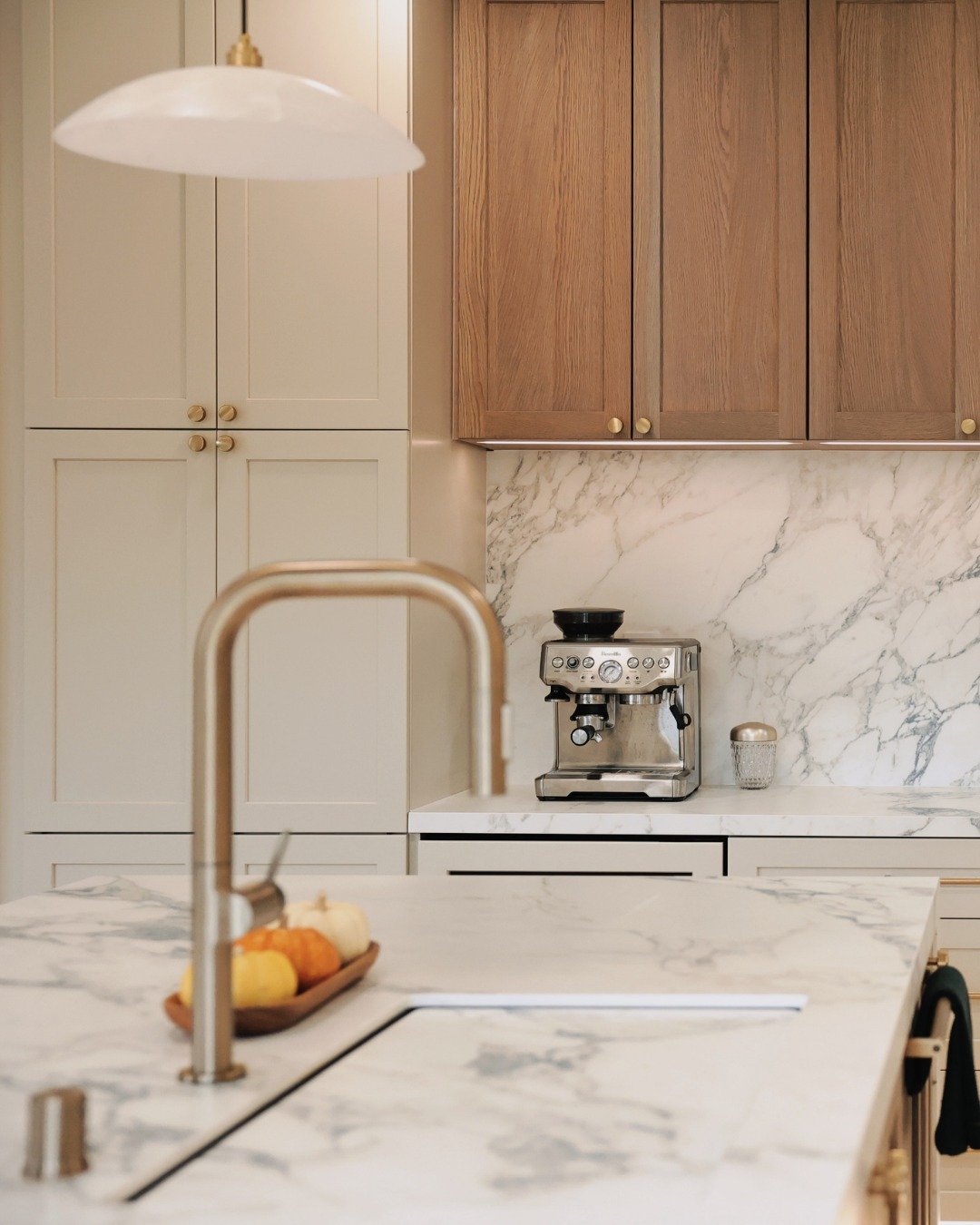 There’s something comforting about this setup, like your favorite café tucked into your own home. The creamy cabinets and soft marble veining create a gentle backdrop, letting that espresso machine moment feel intentional.