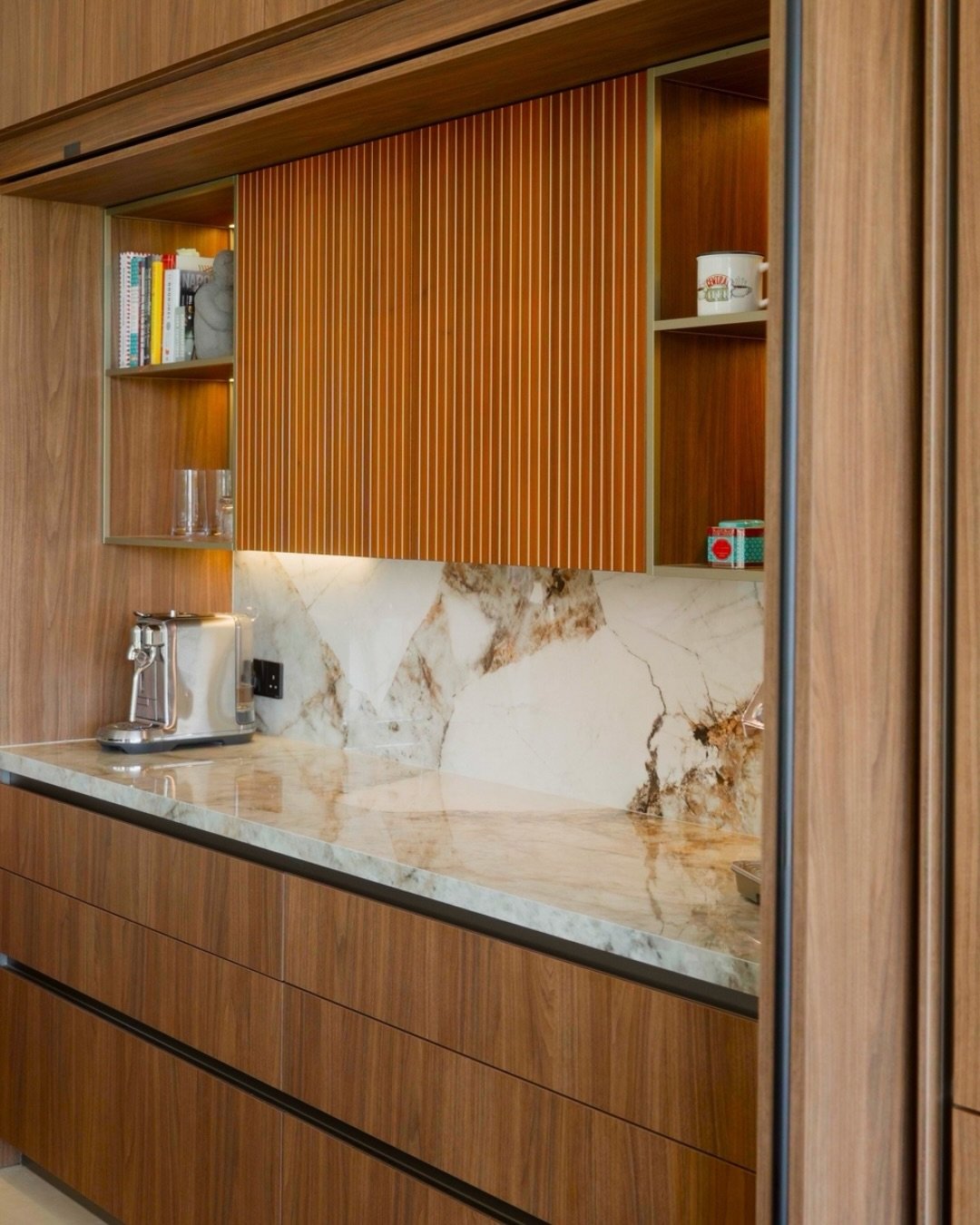 This kitchen feels sleek, but not in a cold, minimalist way. The warm wood cabinetry wraps the space, while the marble quietly reveals itself in the backsplash and countertop, almost like a hidden detail.