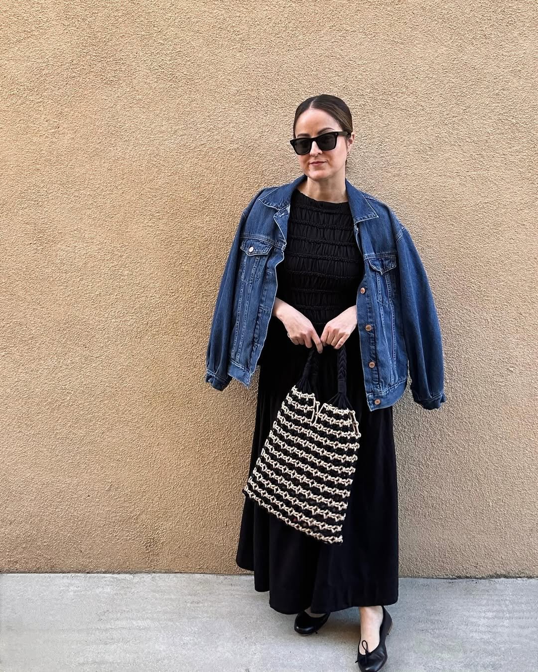 A smocked black midi paired with a denim jacket is such a timeless March move. Add ballet flats and a textured tote, and suddenly it feels city-ready without losing that relaxed charm.