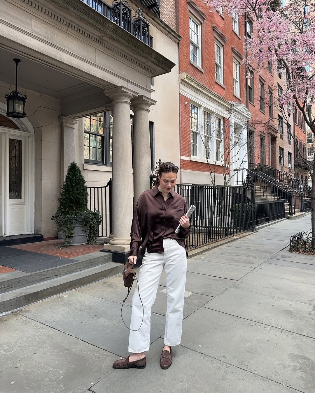 Silky brown button-down paired with crisp white trousers? That’s a spring power move. The loafers keep it grounded while the soft tailoring makes everything feel quietly elevated — like a weekday coffee run that accidentally turns into a photoshoot.
